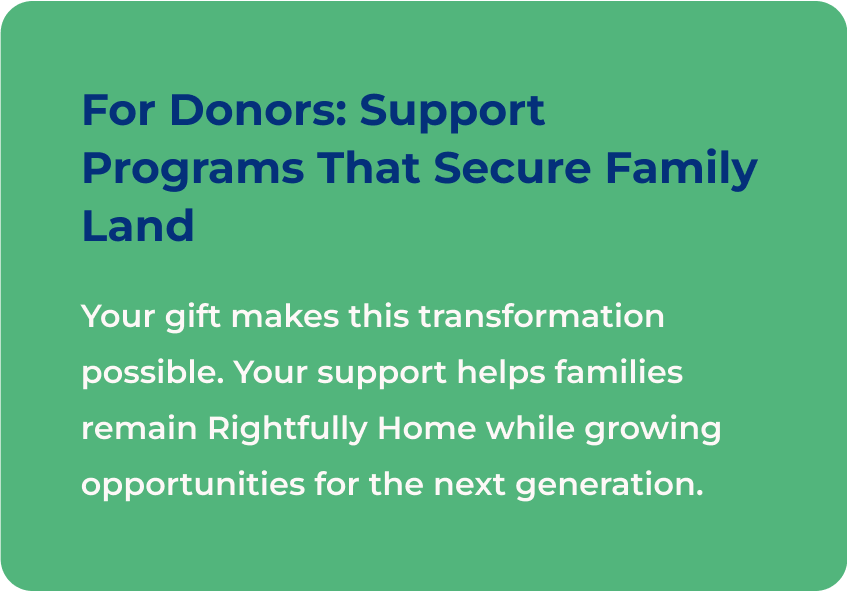 CHP’s work—through legal support, education, and partnership—helps families protect their land, secure ownership, and strengthen communities. Each story, like Patricia’s, moves us one step closer to a future where every family can remain Rightfully Home.