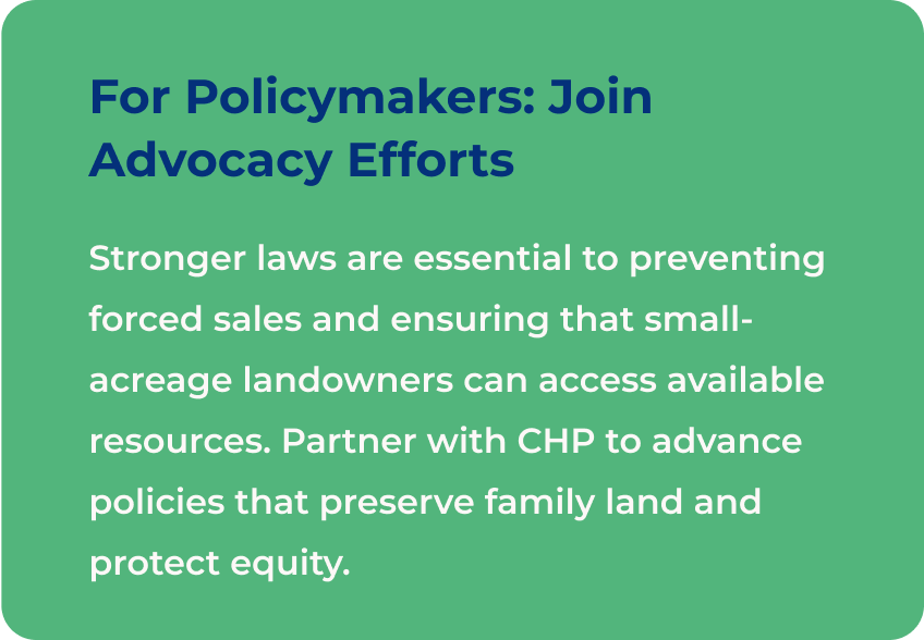 Heirs’ property is not the result of a single mistake or a family’s lack of planning. It’s the result of a complex history and a legal system that often leaves families without clear protections. When families protect their land, they’re not only securing their own future—they’re strengthening entire communities.