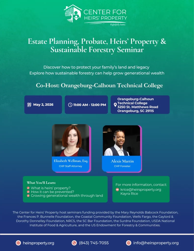 Join us for an Estate Planning, Probate, Heirs’ Property and Sustainable Forestry Seminar on Saturday, May 2, 2026, at the Orangeburg-Calhoun Technical College at 3250 St. Matthews Road, Orangeburg, SC 29115 at 11:00 AM.