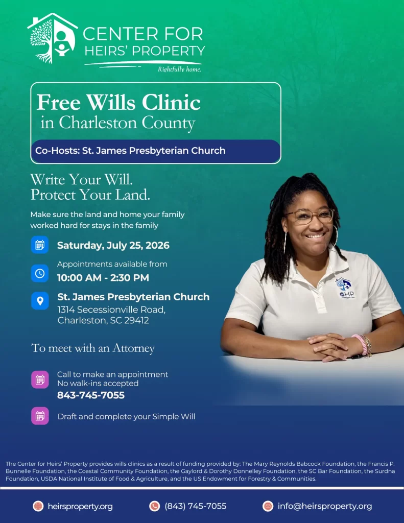 The Center for Heirs’ Property® provides wills clinics as a result of funding provided by: the Mary Reynolds Babcock Foundation, the Francis P. Bunnelle Foundation, the Coastal Community Foundation, the Gaylord & Dorothy Donnelley Foundation, the SC Bar Foundation, the Surdna Foundation, USDA National Institute of Food & Agriculture, and the US Endowment for Forestry & Communities.