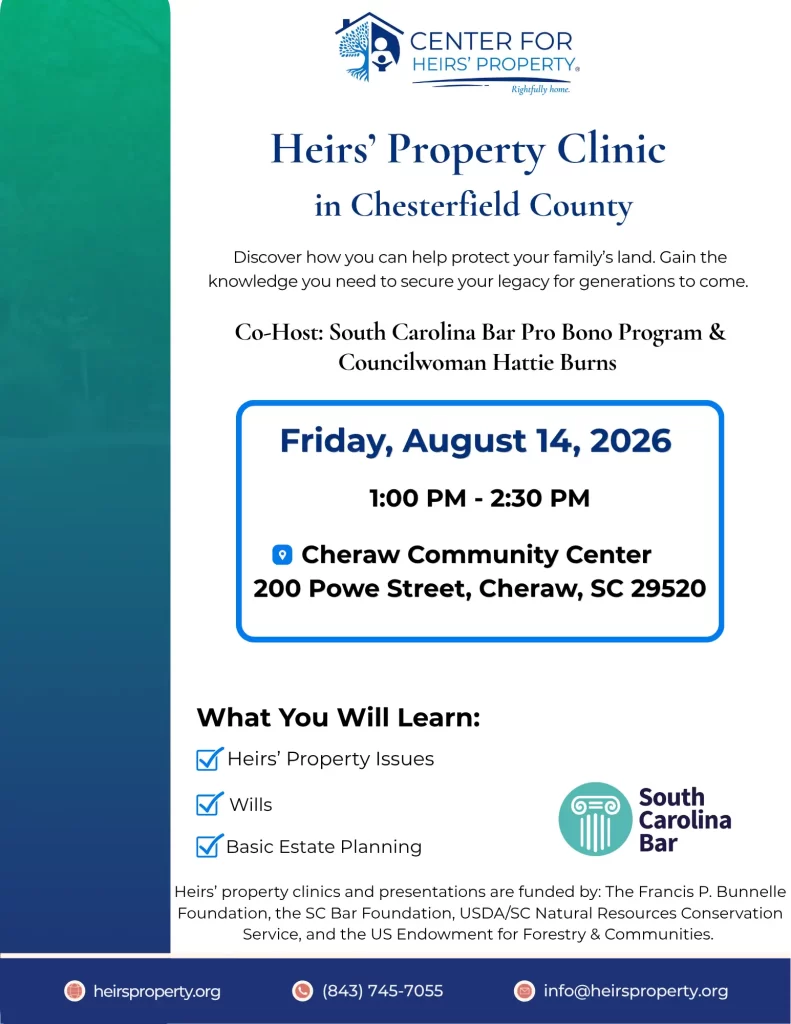 Join us on Friday, August 14, 2026, at the Cheraw Community Center at 200 Powe Street, Cheraw, SC 29520 for an Heirs’ Property Clinic in Chesterfield County at 1:00 PM!