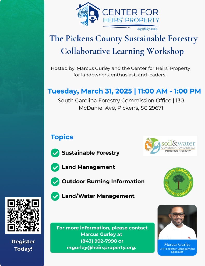 Join us on Tuesday, March 31, 2026, for the Pickens County Sustainable Forestry Collaborative Learning Workshop at the South Carolina Forestry Commission Office at 130 McDaniel Ave., Pickens, SC 29671 at 11:00 AM!